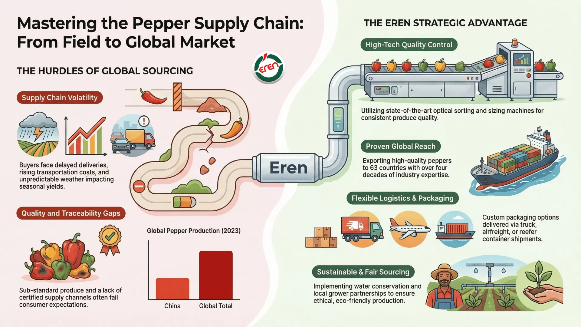 - Tedious import and export regulations, inadequate traceability, and difficulty sourcing specialty or hard-to-find pepper varieties are all challenges that require a strategic supply partner — not just a vendor — to navigate efficiently and profitably.