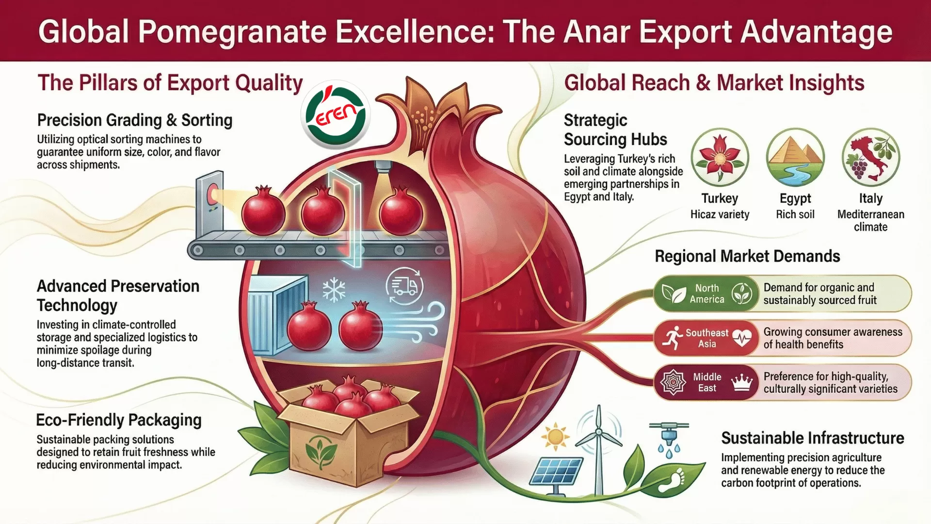 - How does Eren address challenges in pomegranate exporting countries? Eren invests in advanced storage facilities to prevent spoilage during long transit periods, develops cross-border value chain partnerships to share knowledge and resources, and continuously innovates in packaging and logistics to minimize risks and embrace market opportunities.