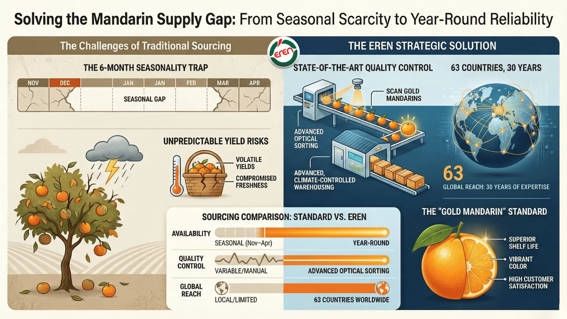 - Are mandarins in season year-round? While the natural season varies by variety and region — running broadly from November through April — Eren's advanced logistics and year-round supply partnerships ensure continuous availability of fresh mandarins regardless of the calendar period.